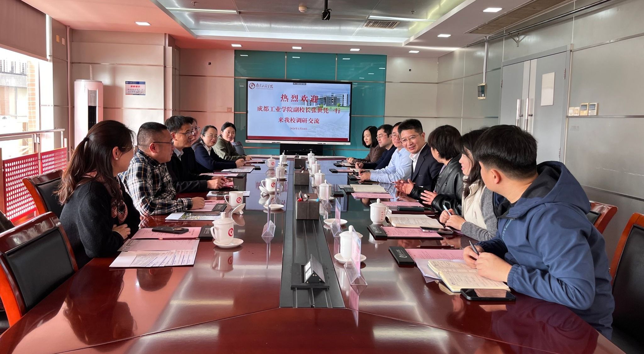 1月14日上午,成都工业学院党委常委、副校长张世凭率队来校调研交流。党委常委、副校长朱松青在至勤楼・行政中心北305会议室热情接待来宾并座谈。党委常委、宣传部部长张焱,学校相关职能部门负责人参加座谈。
