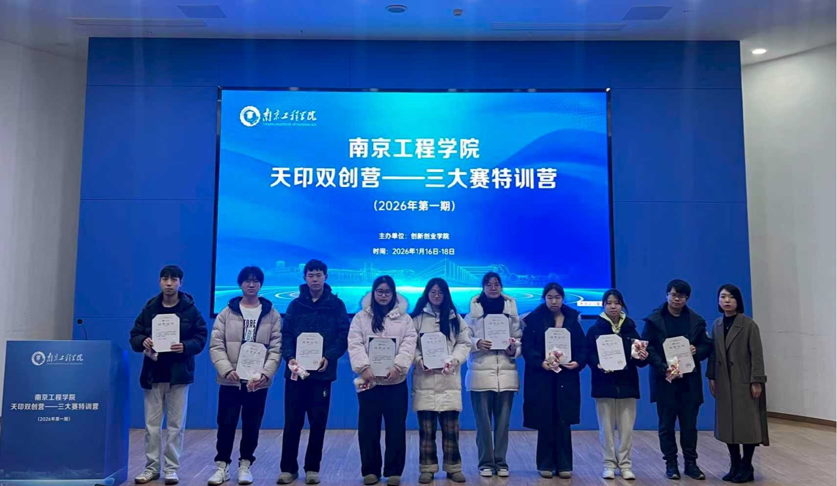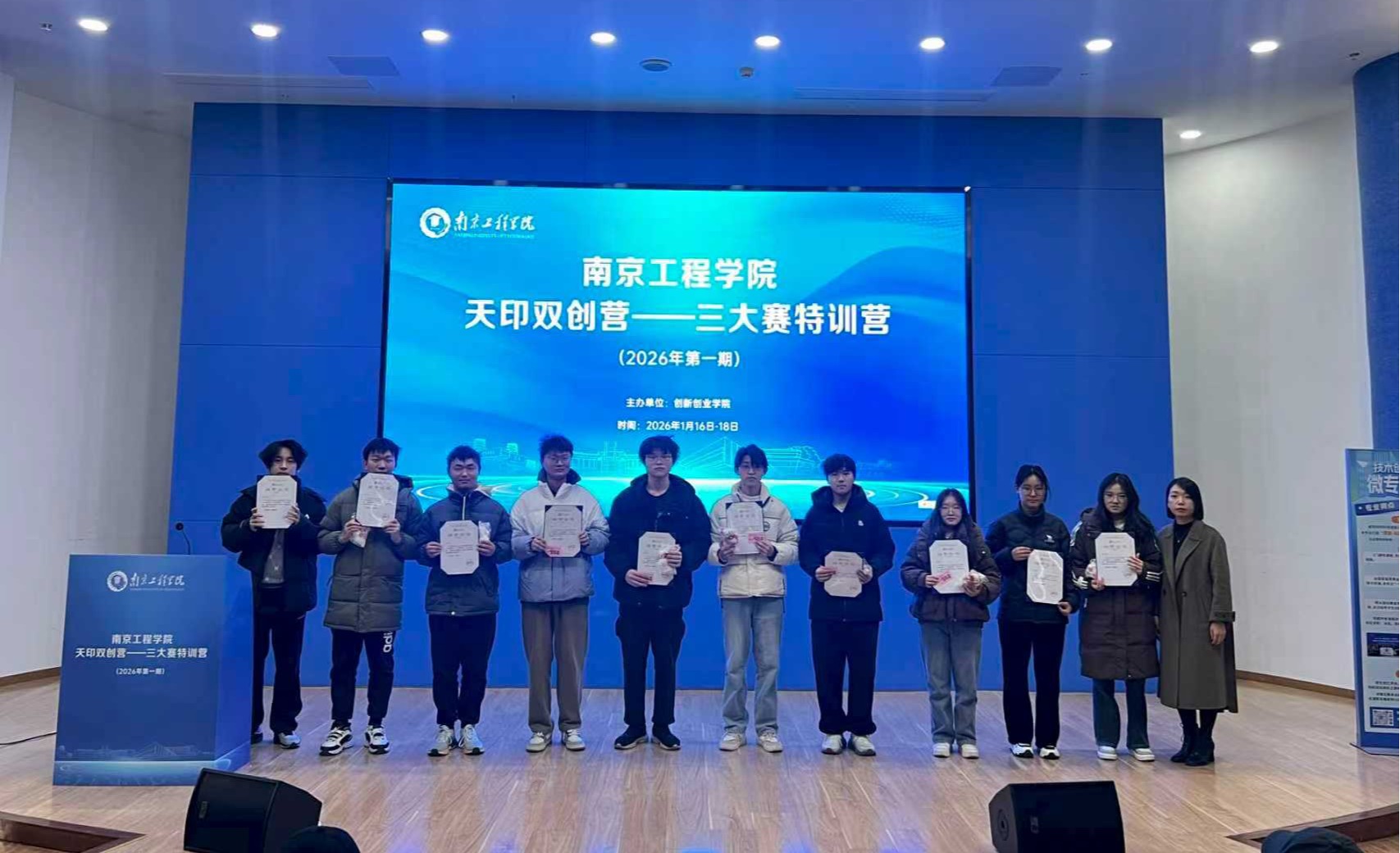 在为期三天的培训中,共开展六场密集专题授课。学员通过系统学习与模拟演练,进一步掌握了赛事逻辑、商业模式设计、计划书优化及路演表达等核心技能。1月18日下午,特训营完成全部教学任务并举行结营仪式。创新创业学院为全程参与的学员颁发了结营证书,以此肯定学员的学习成果,并激励大家在双创道路上继续前行、再创佳绩。