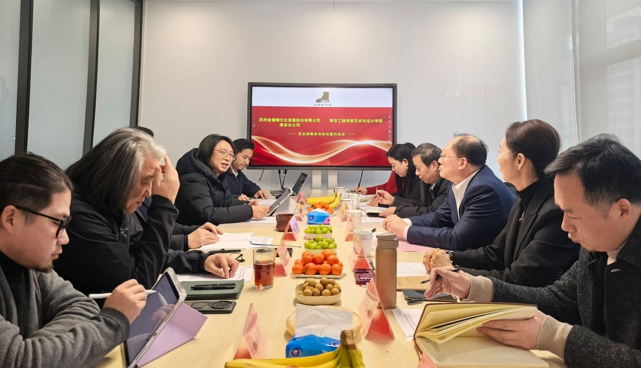 为深化产教融合,推动校企协同育人,进一步拓宽毕业生就业渠道,1月28日下午,党委常委、副校长赵文祥带队赴苏州金螳螂文化发展股份有限公司南京分公司,开展“访企拓岗”专项调研。艺术与设计学院领导班子成员及相关教师陪同参加。