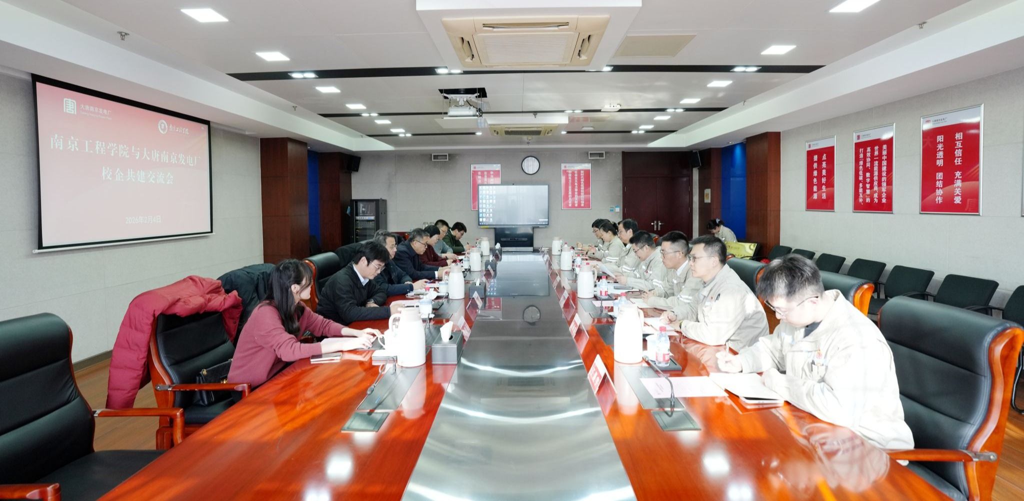 张玉清对电厂坚持“红色基因传承、绿色能源发展”的实践路径表示赞赏,并介绍了学校围绕“一张网”“一度电”“一台床”“一扇门”所形成的学科专业特色与近年高质量发展成果,希望以此次交流与共建为契机,推动双方在党建联建、课程共建、实习实训、科技研发等方面开展深度合作,共同构建产学研用一体化平台,实现资源共享、优势互补。自动化学院、商学院负责人分别介绍了学院学科特色与人才培养情况,并就党建共建、产学研合作提出具体建议。