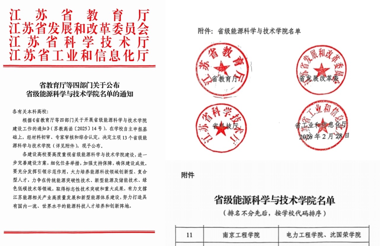 近日,江苏省教育厅、江苏省发展和改革委员会、江苏省科学技术厅、江苏省工业和信息化厅四部门联合发文,公布省级能源科学与技术学院立项建设名单,全省共立项建设13个单位。由永利官网电力工程学院、沈国荣学院牵头,联合南瑞继保、江苏省电科院、常州博瑞以及能源与动力工程学院、通信与人工智能学院、集成电路学院等单位共建的能源科学与技术学院成功获批。这是永利官网在省级专业特色学院建设上取得的又一重要成果,标志着学校在产教融合应用型人才培养改革与学科专业一体化建设方面取得新进展。