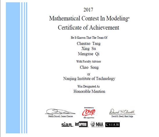日前,2017年美国(国际)大学生数学建模竞赛(MCM/ICM)结果公布,由永利官网数理部宋超博士指导,电力工程学院电力卓越141班唐晨涛、电力154班祁梦雪和计算机工程学院软件151班苏醒三位同学的参赛作品获得国际二等奖(Honorable Mention)。
