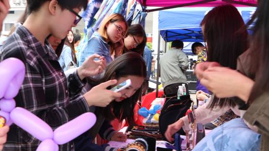 本届创意集市还设有创意体验区,来往的师生在同学们的专业帮助下,用斜口钳配合各种金属配件、水晶、珍珠等工具,DIY出自己设计的饰品。“带上自己设计制作的手链,真是成就感爆棚啊!”参与体验的同学兴奋地说。据该院学生工作负责人介绍:开设集市的目的是为了开发学生创意思维能力、提高创新实践能力和实现创意的有效转化,以激发学生成长发展的自觉性、能动性、创造性。
