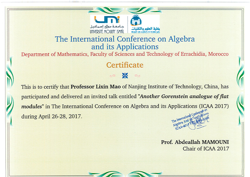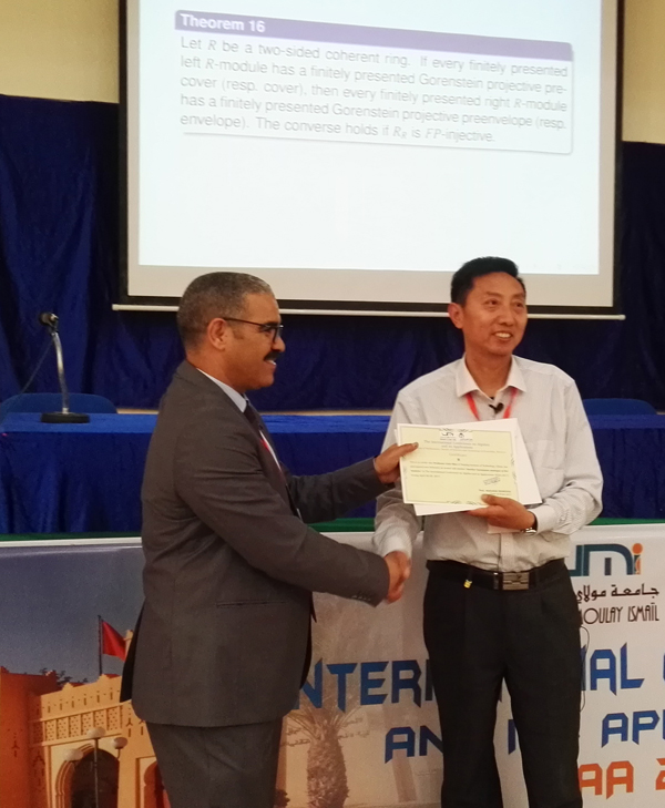 4月26日,国际代数学及应用学术会议(ICAA)在摩洛哥穆莱伊斯梅尔大学开幕。应会议组委会主席、穆莱伊斯梅尔大学数学系Abdellah Mamouni教授邀请,永利官网数理部毛立新教授参加了本次会议,并做了题为《Another Gorenstein analogue of flat modules》的大会邀请报告。他在报告中首次提出了glat模的概念。作为平坦模在Gorenstein情形下的另一种推广,毛立新教授证明了glat模类具有很好的封闭性质和相对同调性质,并得到了glat模和经典的Gorenstein平坦模的内在关系,同时给出了一些应用。这一最新研究成果引起了与会者的浓厚兴趣,报告结束后不少学者与毛立新教授进行了广泛深入的交流。