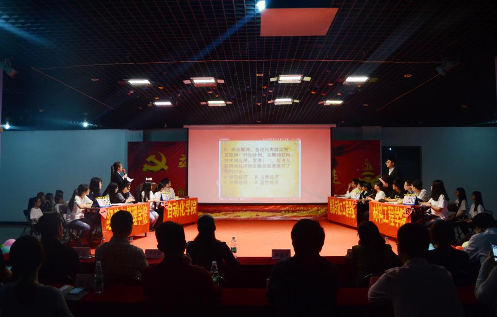 5月9日晚,由校团委主办、人文与社会科学学院承办的永利官网第十一届党团知识团体赛决赛在至馨苑•综合服务楼大学生活动中心举行。本届党团知识竞赛紧紧围绕团中央在全团开展的“学习总书记讲话,做合格共青团员”主题教育活动的精神主旨,以“立德树人兴中华,不忘初心跟党走”为主题,通过竞赛进一步学习党团知识和两会精神,以保持和增强团员青年的政治性、先进性、群众性。校团委、人文与社会科学学院及相关学院师生代表500余人共同观看了比赛。