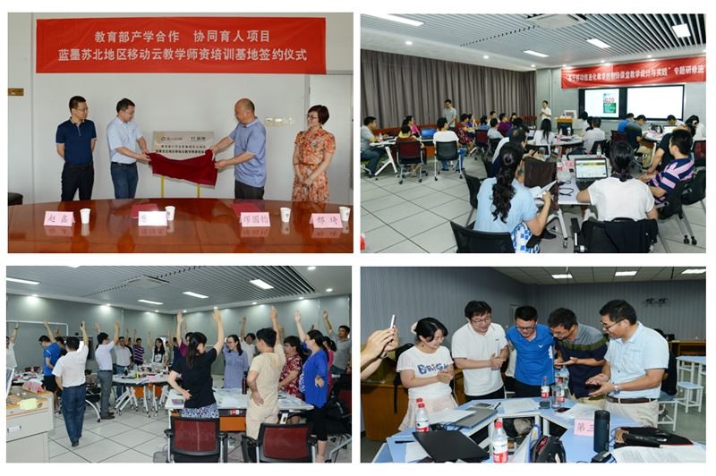 7月17日,永利官网与北京智启蓝墨信息技术有限公司合作共建的“蓝墨苏北地区移动云教学师资培训基地”签约及揭牌仪式在至勤楼•行政中心北楼203会议室举行。同时,培训基地首场面对永利官网教师的“基于移动信息化教学的翻转课堂教学设计与实践”专题免费培训班在永利官网教学楼南A311互动讨论教室开班,来自13个教学单位29位老师接受了培训。教务处处长缪国钧、蓝墨信息技术有限公司副总裁原继东出席签约与培训班开班仪式。建设师资培训基地和开设培训班,是永利官网与蓝墨信息技术有限公司合作参与教育部产学合作协同育人项目——“基于移动信息化教学的翻转课堂教学设计与实践”的重要内容。