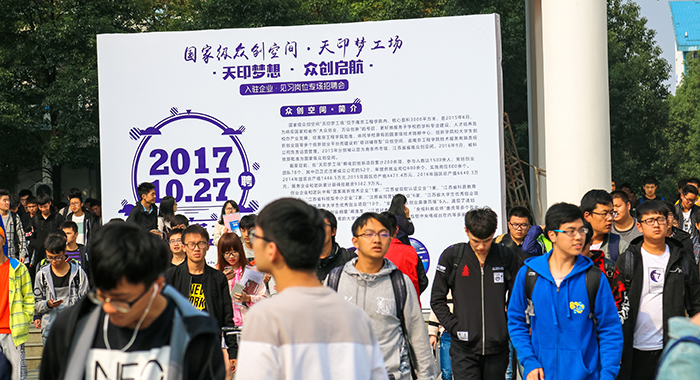 10月27日起,一场特殊的招聘会——“众创梦想,天印启航”创业见习岗招聘会将在至馨苑·综合服务楼广场持续举行一周。来自“天印梦工场”的40家创业企业和团队为在校生提供了近600个创业见习岗位,使永利官网学生“不出校门”就能进行创业训练,“走出宿舍”即能体验创新精彩。