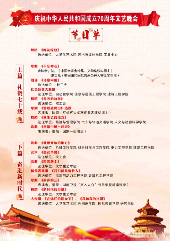 2019年是中华人民共和国成立70周年。隆重庆祝中华人民共和国成立70周年,是全面贯彻落实习近平新时代中国特色社会主义思想和党的十九大精神的重要举措,是党和国家政治生活中的一件大事。根据党中央关于隆重庆祝新中国成立70周年的统一部署和教育部党组、江苏省委教育工委有关精神,按照学校党委《关于印发304am永利集团庆祝新中国成立70周年活动方案的通知》(南工党[2019]41号)文件要求,结合学校实际,现举办庆祝新中国成立70周年文艺晚会,有关事项通知如下:
