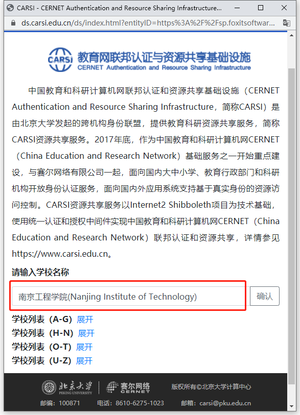 (4) 在CARSI认证页面,输入工号/学号以及信息门户密码;