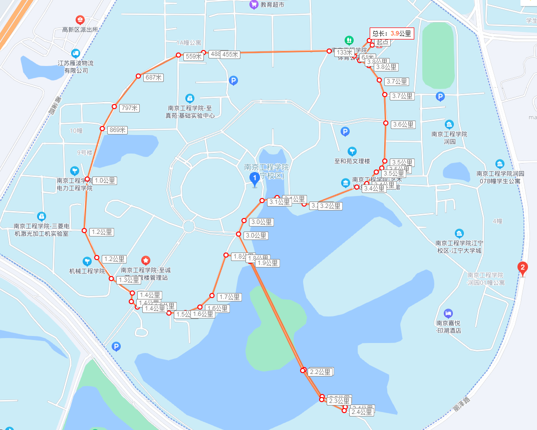 天健苑•体育中心广场→校园环路•北大活→校园环路•工程中心→校园环路•行政中心→映天路(走到尽头调头)→校园环路•学海湾桥→校园环路•门诊部→体育中心广场