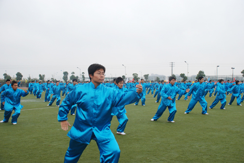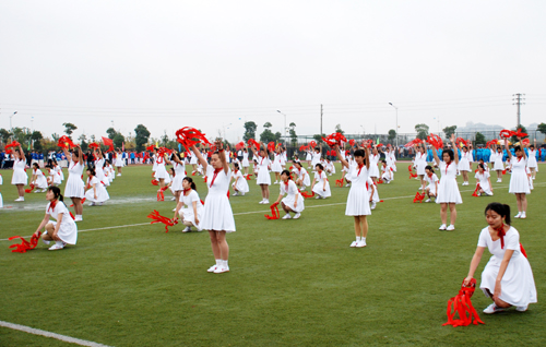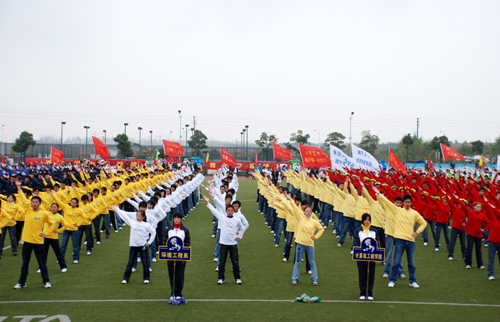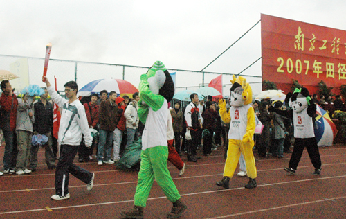 开幕式上,五个可爱的福娃和奥运火炬手闪亮登场,为此次校运会增添了更多奥运气息,体现了本届校运会“向奥运看齐”的特色。开幕式上另一道亮丽的风景就是精彩的体育表演,身着五彩服装的广播操方队首先上场,这是一支充满着青春与活力的队伍,他们精神饱满,气宇轩昂,踏着音乐的节拍,在绿茵场上谱写着青春篇章;接着太极拳方阵迎面走来,整齐划一的动作,彰显出南工学子的风采;健美操班女生更是别出心裁,从运动场四方向中间涌去,如同汹涌的大潮前进在广阔的海洋,场面蔚为壮观,她们将最后的场景定格成奥运五环,让在场的师生惊叹不已。
