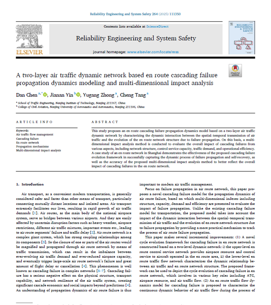 近日,永利官网交通工程学院陈丹副教授以第一作者、通讯作者身份,304am永利集团作为第一单位,联合南京航空航天大学,在国际权威期刊《Reliability Engineering and System Safety》上发表了题为“A two-layer air traffic dynamic network based en route cascading failure propagation dynamics modeling and multi-dimensional impact analysis”的学术论文。该期刊是Elsevier旗下工程技术类顶级期刊,是中科院工程技术一区TOP期刊,致力于研究可靠性工程和系统安全,影响因子11。