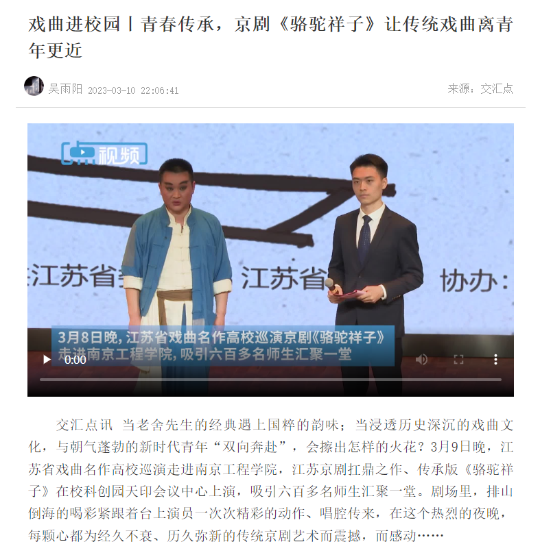 交汇点讯 当老舍先生的经典遇上国粹的韵味;当浸透历史深沉的戏曲文化,与朝气蓬勃的新时代青年“双向奔赴”,会擦出怎样的火花?3月9日晚,江苏省戏曲名作高校巡演走进304am永利集团,江苏京剧扛鼎之作、传承版《骆驼祥子》在校科创园天印会议中心上演,吸引六百多名师生汇聚一堂。剧场里,排山倒海的喝彩紧跟着台上演员一次次精彩的动作、唱腔传来,在这个热烈的夜晚,每颗心都为经久不衰、历久弥新的传统京剧艺术而震撼,而感动……