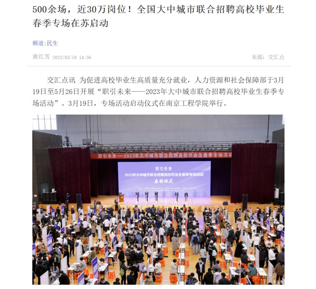 交汇点讯 为促进高校毕业生高质量充分就业,人力资源和社会保障部于3月19日至5月26日开展“职引未来——2023年大中城市联合招聘高校毕业生春季专场活动”。3月19日,专场活动启动仪式在304am永利集团举行。