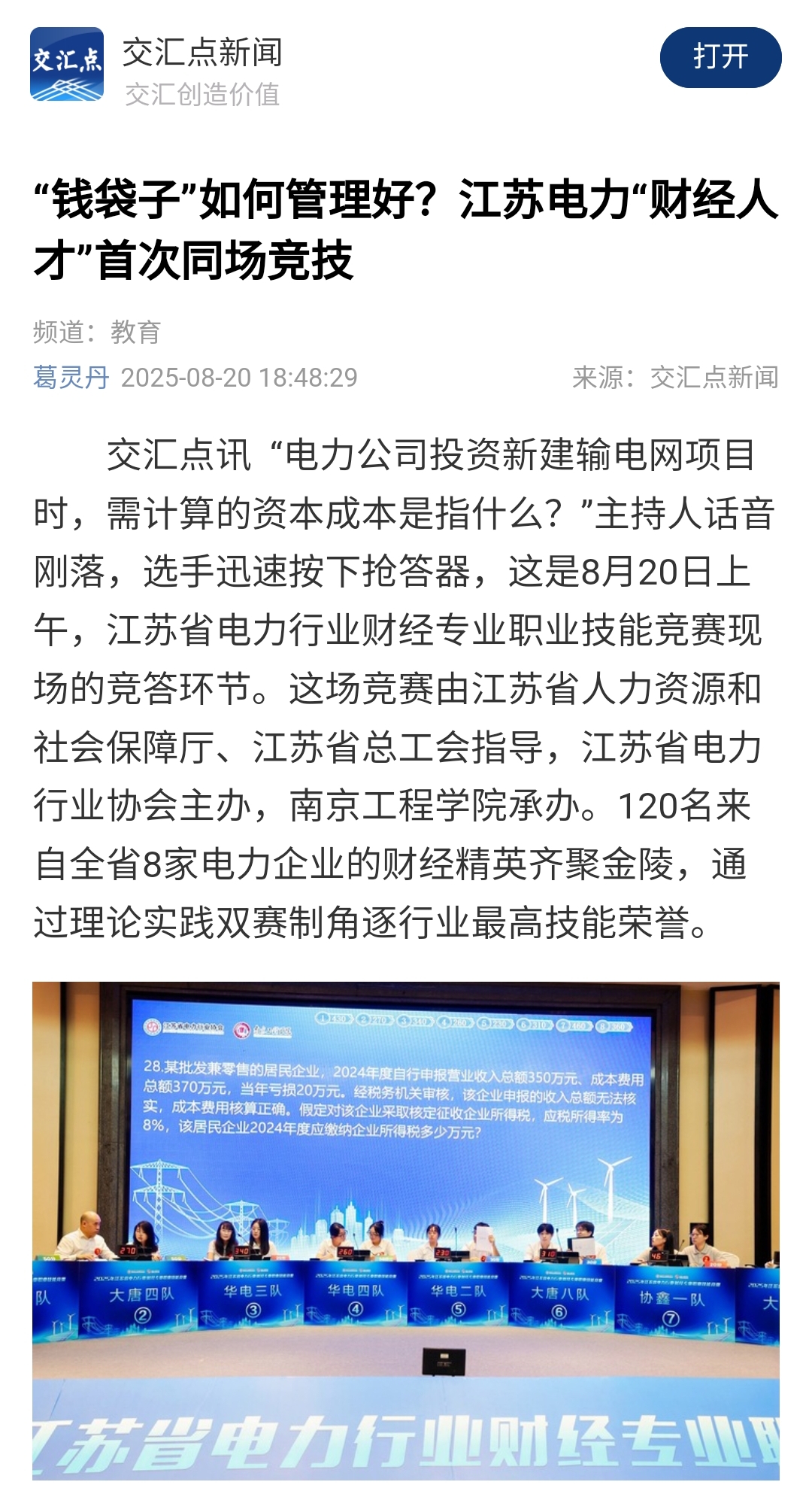 交汇点讯 “电力公司投资新建输电网项目时,需计算的资本成本是指什么?”主持人话音刚落,选手迅速按下抢答器,这是8月20日上午,江苏省电力行业财经专业职业技能竞赛现场的竞答环节。这场竞赛由江苏省人力资源和社会保障厅、江苏省总工会指导,江苏省电力行业协会主办,304am永利集团承办。120名来自全省8家电力企业的财经精英齐聚金陵,通过理论实践双赛制角逐行业最高技能荣誉。