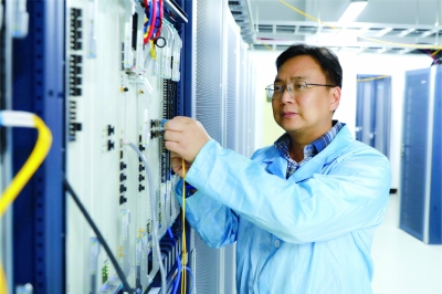 胡峰在机房进行网络设备组网调测。 学校供图