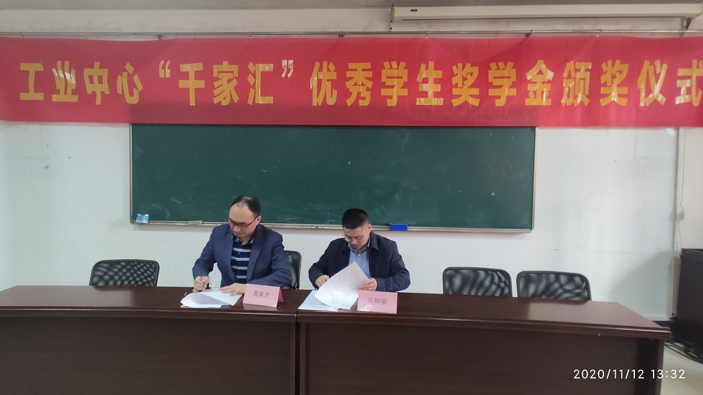 江苏千家汇智能装备科技有限公司位于江苏宿迁,致力于各类织机的研发,公司是“国家高新技术企业”,并成功在“江苏股权交易中心”挂牌上市。此次千家汇公司向工业中心捐赠学生“奖学金”一万元,用于奖励工业中心品学兼优的2017级学生,共有十名同学获奖。颁奖仪式现场,中心主任黄家才对“千家汇”公司的爱心捐赠表示了衷心地感谢。他说,工业中心将不忘初心,坚持培养应用型特色人才理念,积极与企业开展合作,不断提高中心的人才培养质量和毕业生竞争力。公司副总吴和福表示,欢迎同学们到千家汇来发展,公司将着力为年轻人提供良好的发展条件和平台。会上,双方共同签署了校企捐助协议,并为获奖同学颁奖。