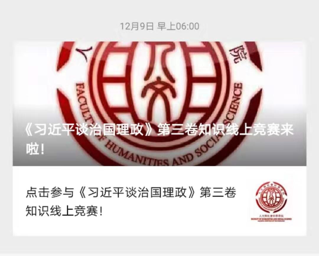 为推动全体教师党员学好用好《习近平谈治国理政》第三卷,用党的创新理论武装头脑、指导实践、推动工作,12月9日-11日人文与社会科学学院党总支开展《习近平谈治国理政》第三卷线上知识竞赛。