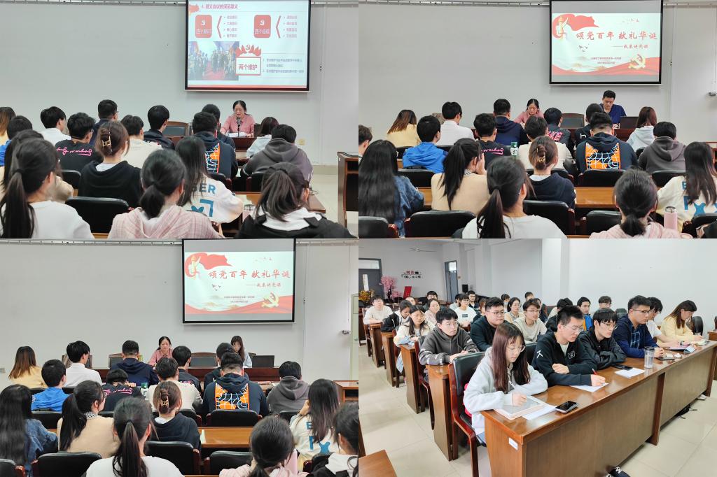 会上,曹成老师选取重要时间节点,就第一个党章的诞生、井冈山精神、水口连队建党、遵义会议、张思德战士等进行了深入讲解,用历史事件和人物案例为党员们厘清历史脉络,阐明历史观点。她强调,学生党员要进一步坚定理想信念,提高自身政治站位,不断增强党史知识储备,做到学史明理、学史增信、学史崇德、学史力行。学生党员徐靖翔和徐婉妮讲述了淮海战役“十人桥”、毛泽东与三口红井的故事,展示了共产党人用生命和鲜血铸就的信念与忠诚、永远坚守的初心和使命。学生党员们纷纷表示要将党史教育的核心精神内化于心、外化于行,坚守初心、砥砺奋斗,为中华民族伟大复兴中国梦添砖加瓦。