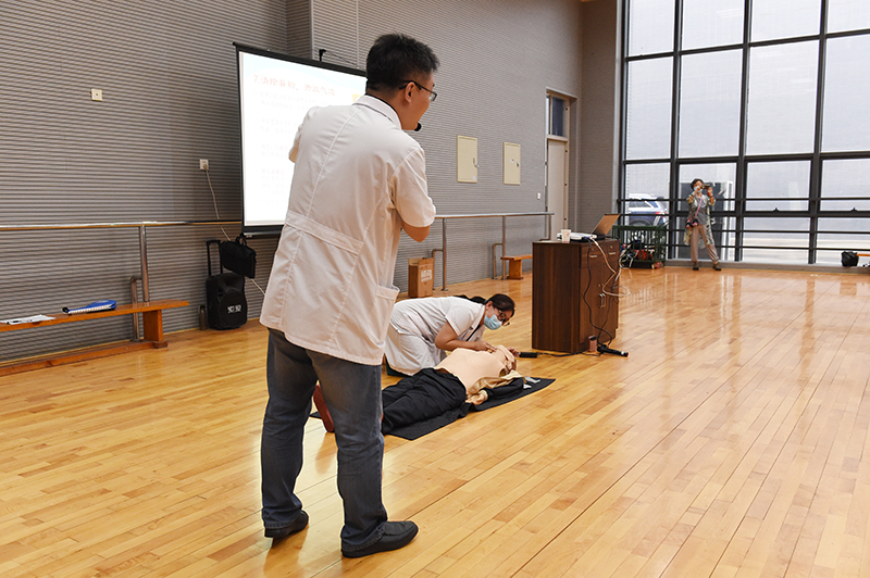 此次培训分为理论教学和实践操作两个环节。校门诊部健康教育指导中心叶长青主任和谢艳医师通过生动的事例介绍了“急救黄金10分钟”,让大家领会“时间就是生命”的深刻含义,结合工作和生活中常见的心脏骤停、脑卒中、异物卡喉等意外紧急情况向教职工们讲解并演示了心肺复苏法(CPR)、海姆立克急救法等应急救护知识和自动除颤仪(AED)的使用方法。实践操作环节中,校门诊部医务人员利用心肺复苏训练模拟人等医疗器械,手把手指导教职工正确的急救动作,并及时指出大家在实践模拟过程中的不规范操作。