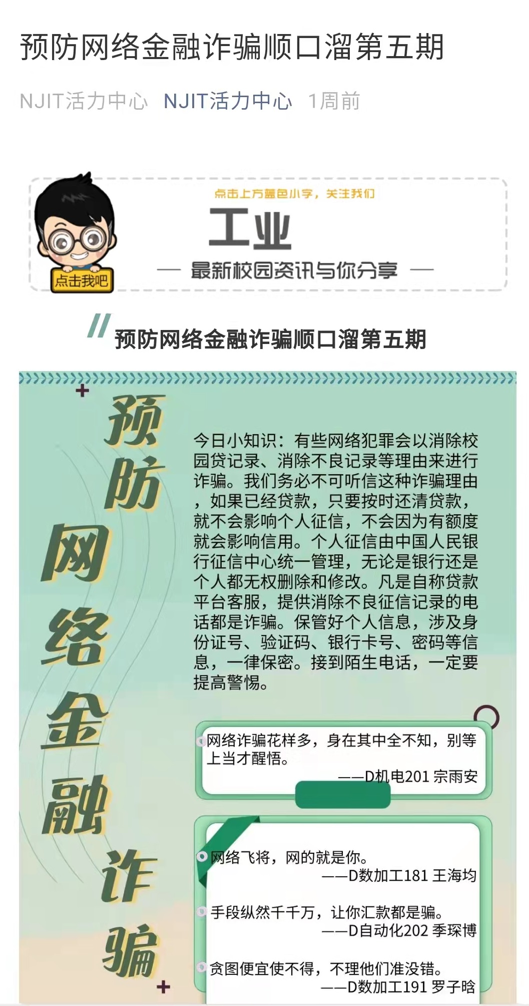 开学以来,工业中心在各班级开展了“一人一句顺口溜,防诈反骗我带头”防诈骗教育活动,着力营造防范网络诈骗的良好氛围,提高同学们的反诈骗警惕性。