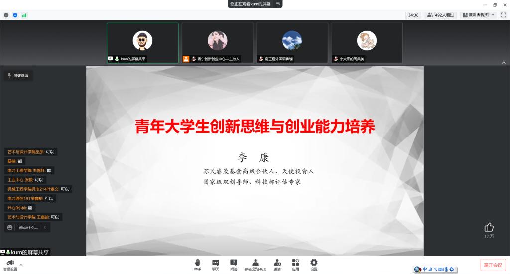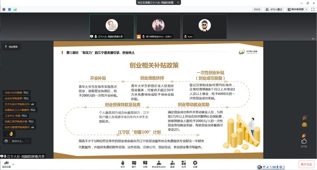 为加强疫情期间创业政策宣传,服务大学生创业需要,4月13日下午,由江宁区人力资源和社会保障局、江宁大学城创新与服务办公室指导,永利官网和南京青创宁盟企业管理有限公司共同主办的“宁聚计划”政策宣讲会暨大学生创业园“天印梦工场”创业沙龙以线上会议形式举行。江宁区领导、永利官网相关职能部门负责人、学工线创业工作负责教师及各二级学院(中心)有创业意愿的学生共460余人相聚云端,共话创业。