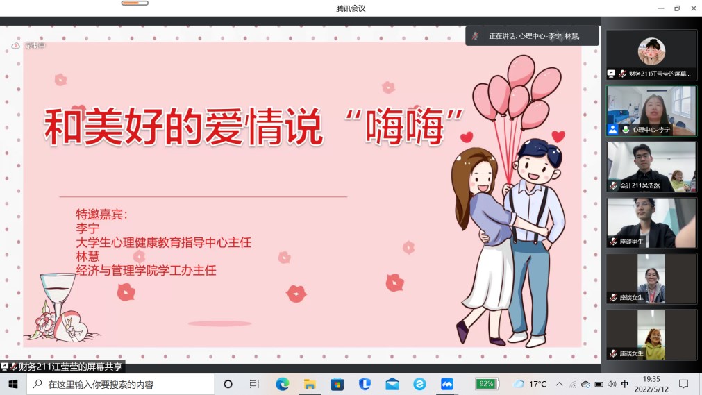 “爱一个人事什么样的感觉?”“恋爱中的双方最希望得到什么样的关爱与浪漫?”5月12日晚,由学校心理健康教育中心策划主办、经济与管理学院承办的第十七届“525·我爱我”心理健康教育月之“心事·心聊——与美好的爱情说嗨嗨”活动直播间异常热闹,近400余名同学展开热烈讨论。