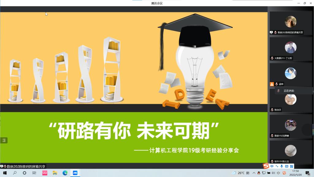 为帮助2019级学生明确考研目标,掌握考研复习技巧,5月20日,计算机工程学院举办线上“研路有你,未来可期”考研经验分享会。分享会邀请2022届成功考取研究生的学生代表作为主讲,备战考研学生聆听学习。