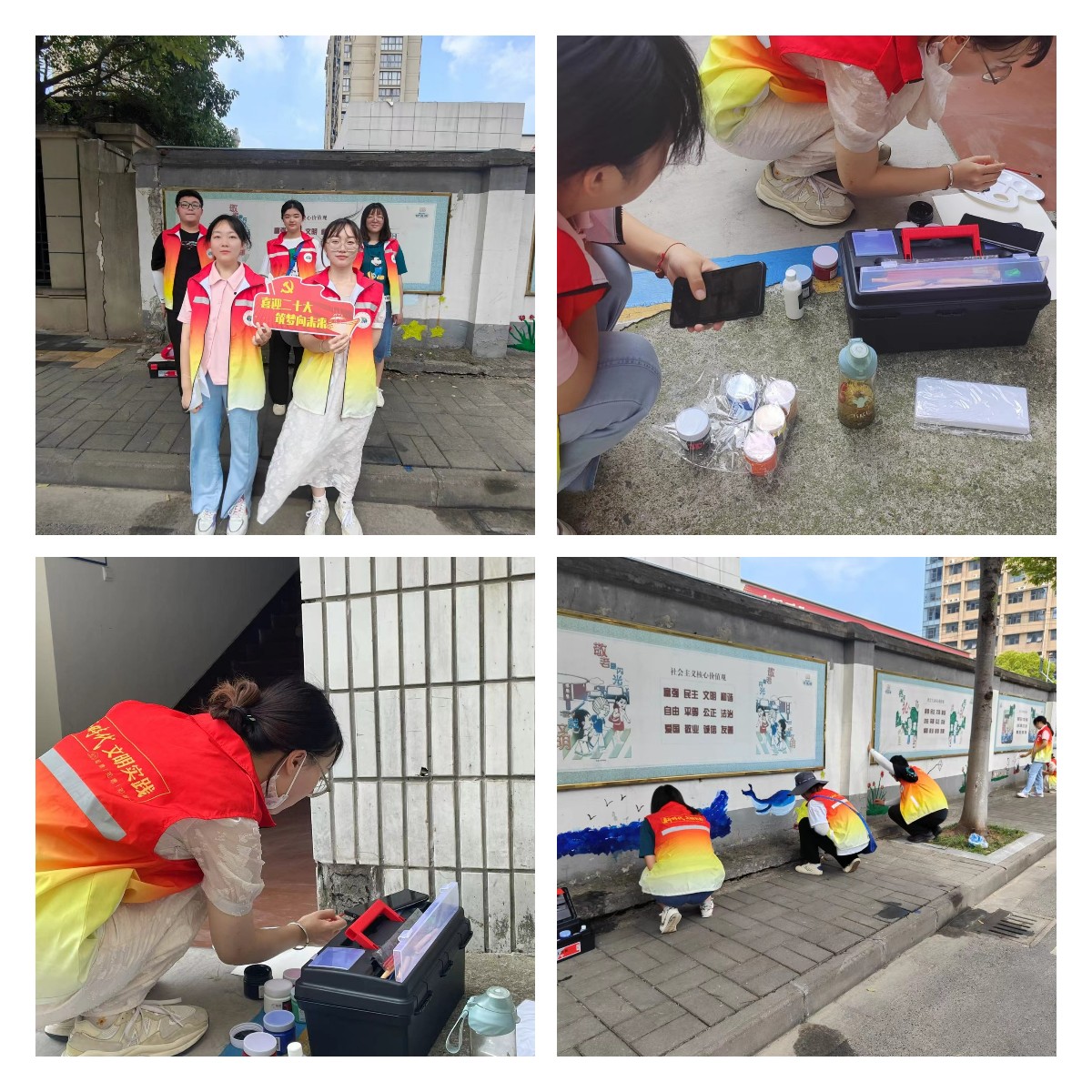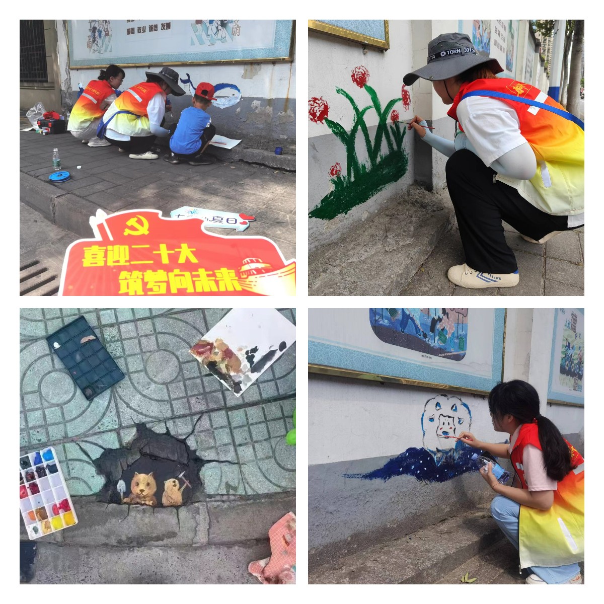 团队成员积极与乡委负责人联系,制定实践方案,为乡村美化献上一份力量。烈日当头,同学们不畏暑热,发挥灵感进行彩绘创作,为乡村一隅添上一抹亮丽风采。服务厅门口掉落的瓷墙,乡村墙壁上损坏的裂缝,石板路上残缺的一角……这些都成为青年学子发挥创造性的灵感场所。期间,路边的小朋友们也停下脚步,好奇寻问,主动要求帮忙,为乡村的美化贡献一份绵薄之力。队员们说道:“与骄阳同行,与高温为伴。虽然我们能做的微不足道,但实践的热情比这酷热的天气更胜一筹!”