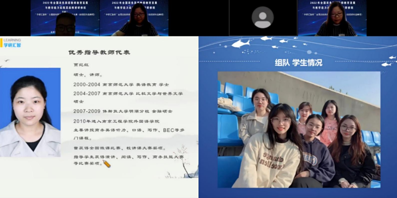 近日,由国际商务英语培训与考试中心联合相关单位主办的“全国商务英语教师教育发展与教学能力实践高级师资研修班”线上专题研修会顺利召开。应主办方邀请,永利官网外国语学院贾纪红老师作为“学研汇智杯”全国高校商务英语综合能力大赛优秀指导教师作交流发言。