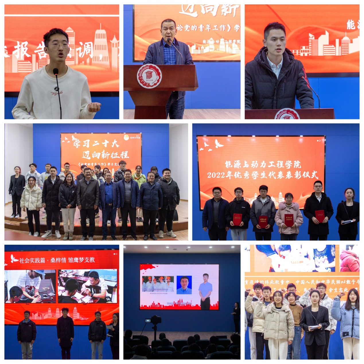 青春逢盛世,奋斗正当时。近日,能源与动力工程学院在文博苑•逸夫图书信息中心报告厅开展《论党的青年工作》学习交流暨2022年度优秀学生表彰大会,全面深入学习习近平总书记关于青年工作的重要思想以及党的二十大精神,从不同类别、不同视角展现当代青年大学生良好的精神风貌,充分发挥优秀学生的榜样引领作用。该院主要党政领导、全体辅导员老师以及近千名同学通过线上线下相结合的方式参加了本次活动。