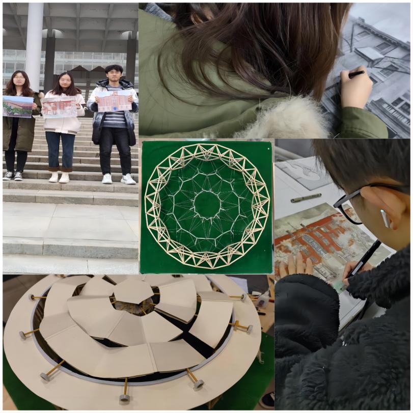 立足专业特色,展现青年风采。建筑工程学院多个团支部围绕学习党的二十大主题,结合专业方向,组织班级同学开展特色实践团日活动。其中建筑学222团支部选取北大红楼为对象,以素描、彩绘、临摹等多种形式绘制,在建筑美学的基础上融合思想教育学习,凸显新时代青年报国之志。土木2107团支部以土木专业知识为基础,聚焦可持续发展理论,在班级内部展开新时代建筑结构创新设计比赛,手工制造出多个造型新颖、结构稳定的建筑物,体现了当代青年矢志建设新时代的初心。