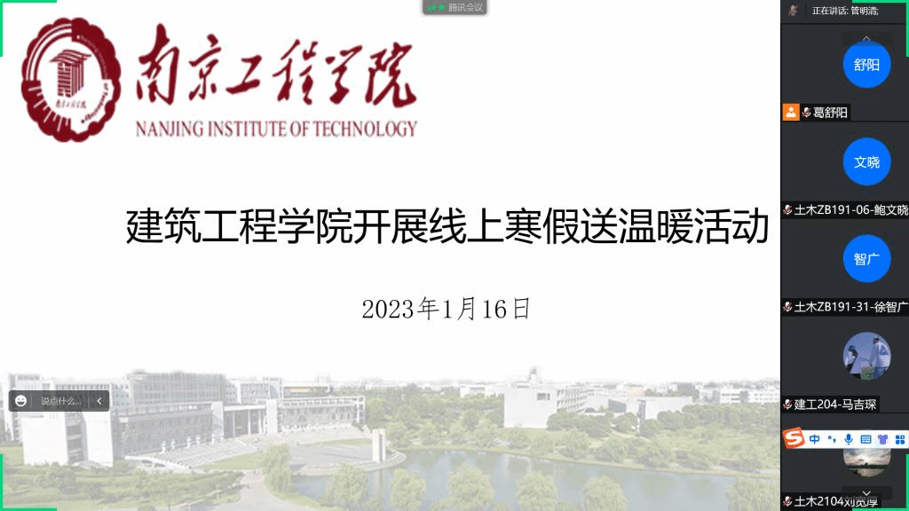 寒冬送温暖,家访暖人心。为深入了解困难学生家庭经济状况和受助需求,把学校对家庭经济困难学生的关怀落实落细,1月16日,建筑工程学院以线上会议的形式进行寒假家访慰问活动。学院党委书记陆彤焜、党委副书记管明清以及年级辅导员先后与受助的5名学生以及学生家长代表进行交流和沟通。