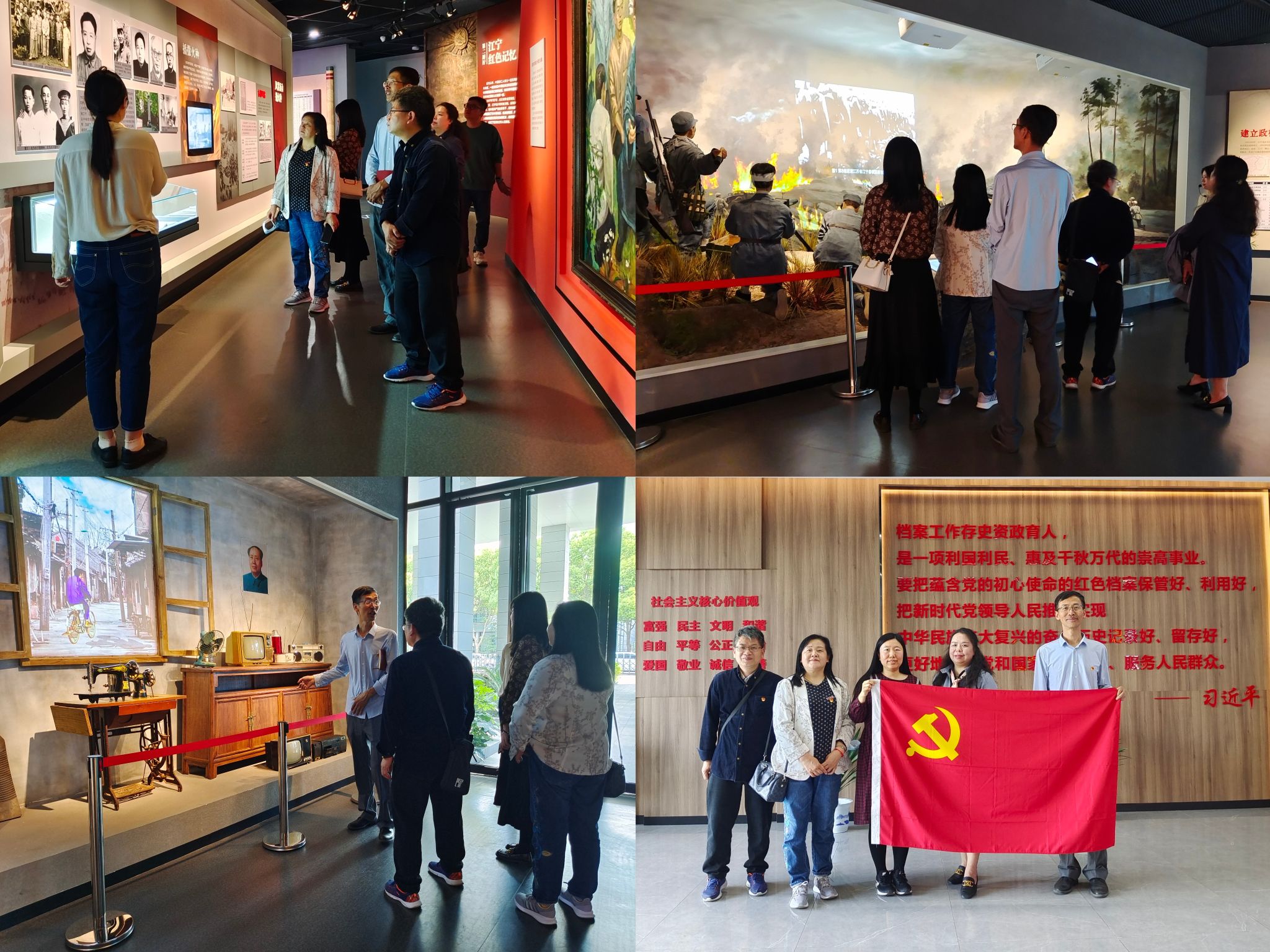 江宁区档案馆位于江宁区崇业路2号,主管全区的档案管理、业务指导、档案的集中管理和开发利用,是国家一级综合档案馆、江苏省爱国主义教育基地、江苏省中小学档案教育社会实践基地、江苏省5A级数字档案馆。作为省、市、区三级爱国主义教育基地,区档案馆主动发挥档案育人功能,高水平打造了1500平方米的档案展览馆,集中展出了700多幅照片、110多件珍贵档案、3.6万字的档案资料,并结合体感互动、裸眼3D、场景复原、透明屏、泥塑等新技术、新手段,用“档案+科技+艺术”的形式,将一个既古老又现代的江宁真实生动地展现在大家面前。在讲解员的带领下,大家依次参观了“江宁历史记忆”“江宁红色记忆”“江宁发展记忆”三大主题展厅和“走进档案”专题展厅,在一份份历史图表和一张张珍贵照片前驻足停留,体验多媒体互动的各种展览装置,沉浸式感受档案中讲述的鲜活故事。大家纷纷表示,要牢记习近平总书记的殷切嘱托,把蕴含党的初心使命的红色档案保管好、利用好,把新时代党领导人民推进实现中华民族伟大复兴的奋斗历史记录好、留存好,更好地服务党和国家工作大局、服务人民群众!