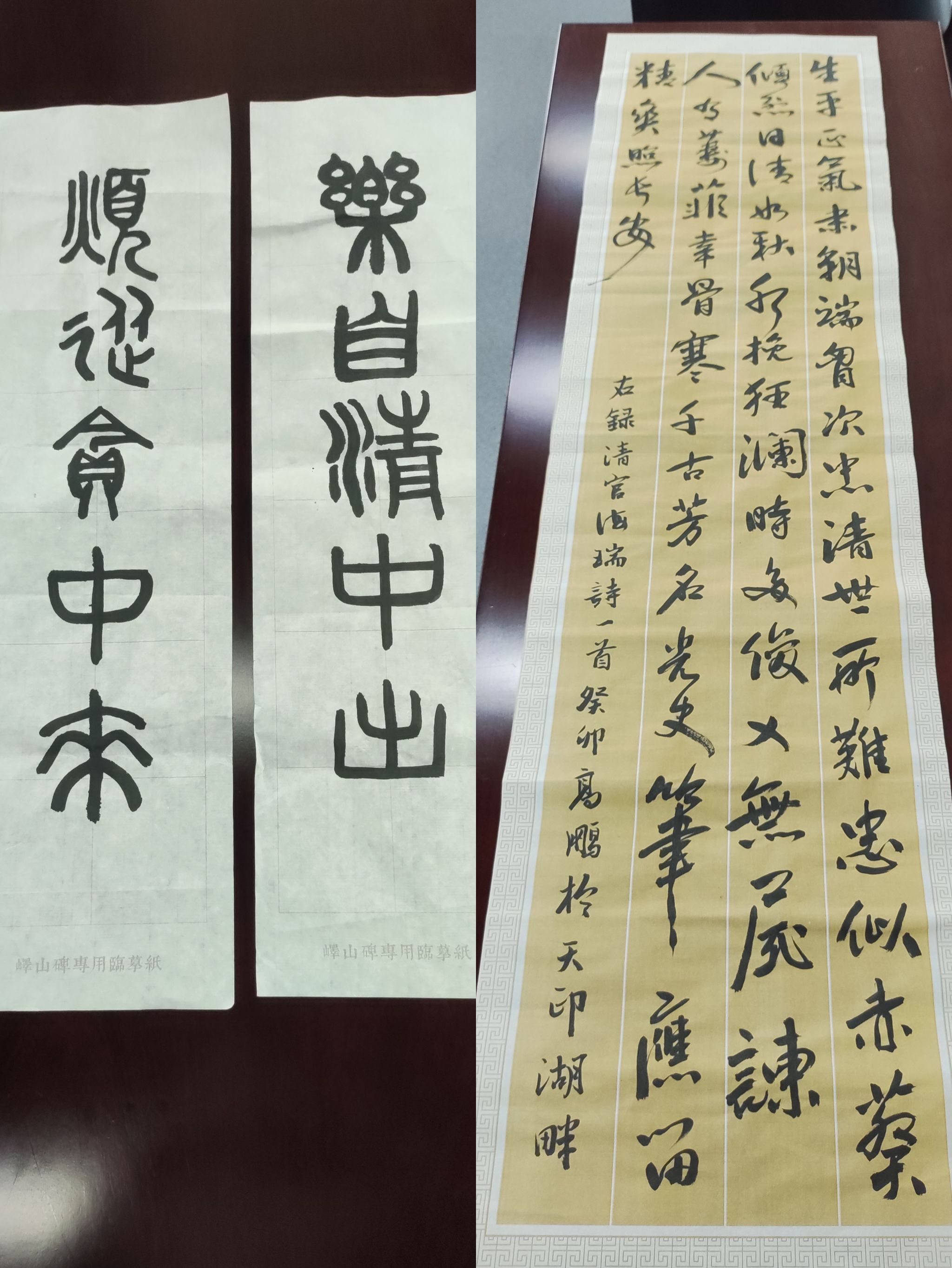 “廉洁文化”主题作品创作热情高。5月22日,该院教师积极响应学校关于“廉洁文化”主题作品的征集活动,积极参与,踊跃投稿,经过评选最终从20多件书法、绘画、摄影作品中,精心选取出两件作品参加展示。其中,学院吴岭老师手写小篆“乐自清中出,忧从贪中来”,从个人忧与乐两方面表达了对清廉文化的高度赞扬。高鹏老师则手书一首——明朝清官海瑞歌颂凌霄汉廉洁精神的诗歌,表达了对清官海瑞的悼念以及对廉政精神的颂扬。通过两位老师的作品展示,体现了马克思主义学院教师的廉洁之心,对学院廉洁文化的建设起到了积极作用。