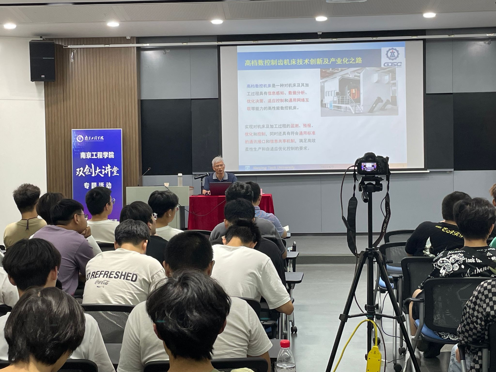 洪荣晶是南京工业大学教授、博士生导师、南京工大数控科技有限公司副董事长、南京工大数控科技有限公司研究院院长,南京工业大学数字化制造及测控技术团队负责人,曾获江苏省科技进步奖一等奖、中国专利金奖和中国产学研合作创新成果奖。报告会上,洪教授从智能制造行业热点出发,告诉同学们高档数控机床和机器人是智能制造工程的关键技术装备,而高端装备制造业正在成为行业的新热点。他从基础理论创新、设计方法创新、产业化之路创新三方面讲解了高档“数控制齿机床”技术的难点、破解思路和方法,以及其团队基于数控制齿机床的创业历程。讲座内容既有严密的公式理论分析,也有生动的产业化过程,展现了高档数控制齿机从理论创新突破到落地发展壮大的全过程,凸显了中国数控机床研究工作者不甘人后、迎难而上、大胆创新、奋勇向前的优秀精神。