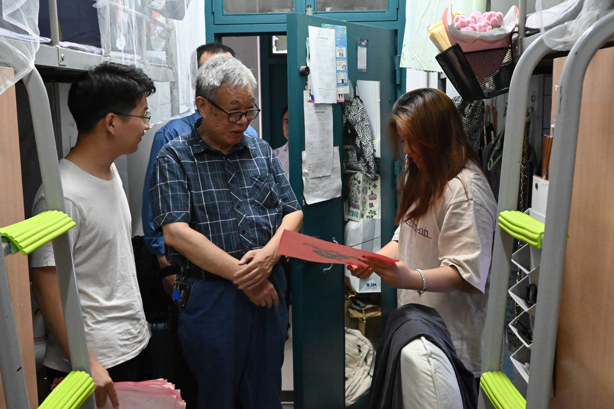 当天下午,洪老师与学院党政领导一行前往宿舍看望同学们,并亲切地赠予大家福字。“学习忙不忙?”“天气热了,注意饮食,照顾好自己。”老师们一边赞赏着同学们对于宿舍的精心布置,一边鼓励同学们要坚持学习,再接再厉,树立崇高目标,学好专业知识与技能,让自己成长为德智体美劳全面发展的时代新人。“感谢老师们的关怀与祝福,我们一定不辜负老师的期望,爱护宿舍、爱护同学、爱护学校,发挥模范带头作用,与身边同学一起努力学习,不断前进。”此次活动的举办不仅增强了同学们的集体荣誉感,也进一步加深了师生之间的联系,同学们表示将以更加饱满的热情和奋发向上的精神,努力学习和生活,回报教师们的辛勤付出和关爱。