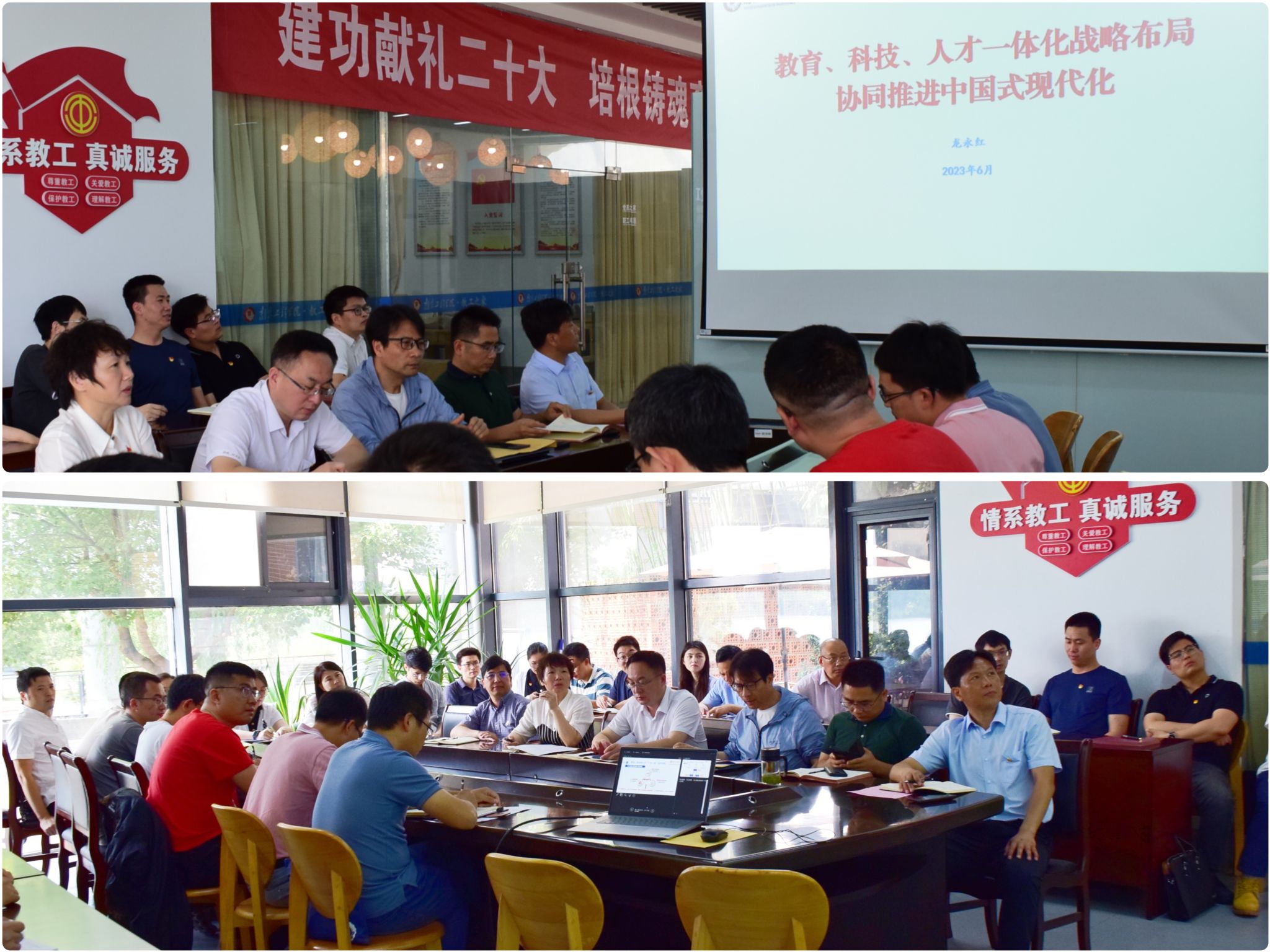 专题党课中,龙永红书记结合科技与产业工作实际,作了题为“教育、科技、人才一体化战略布局协同推进中国式现代化”的专题报告。她详细解读了教育、科技与人才“三位一体”的具体内涵,分析了“三位一体”协同发展可能面临的问题,并谈到了“三位一体”协同发展推进中国式现代化的主要路径,尤其要扎牢人才自主培养内循环根基。她希望青年党员们深刻理解新时代人才强国战略目标和内涵,主动担起教育工作者和科技青年的责任,抓住开展科研工作的“黄金期”,主动担负起国家青年科技人才使命,正视眼前“问题”,寻求突破“路径”,提升科研能力,切实把学习效能转化为推动学校事业高质量发展的实际成果。吕东升、朱琳、陈烨和陈誉四位支部书记结合工作实际,先后汇报交流了本支部活动开展情况,提出以“联学联建联创”方式推进党建与业务的双融双促。
