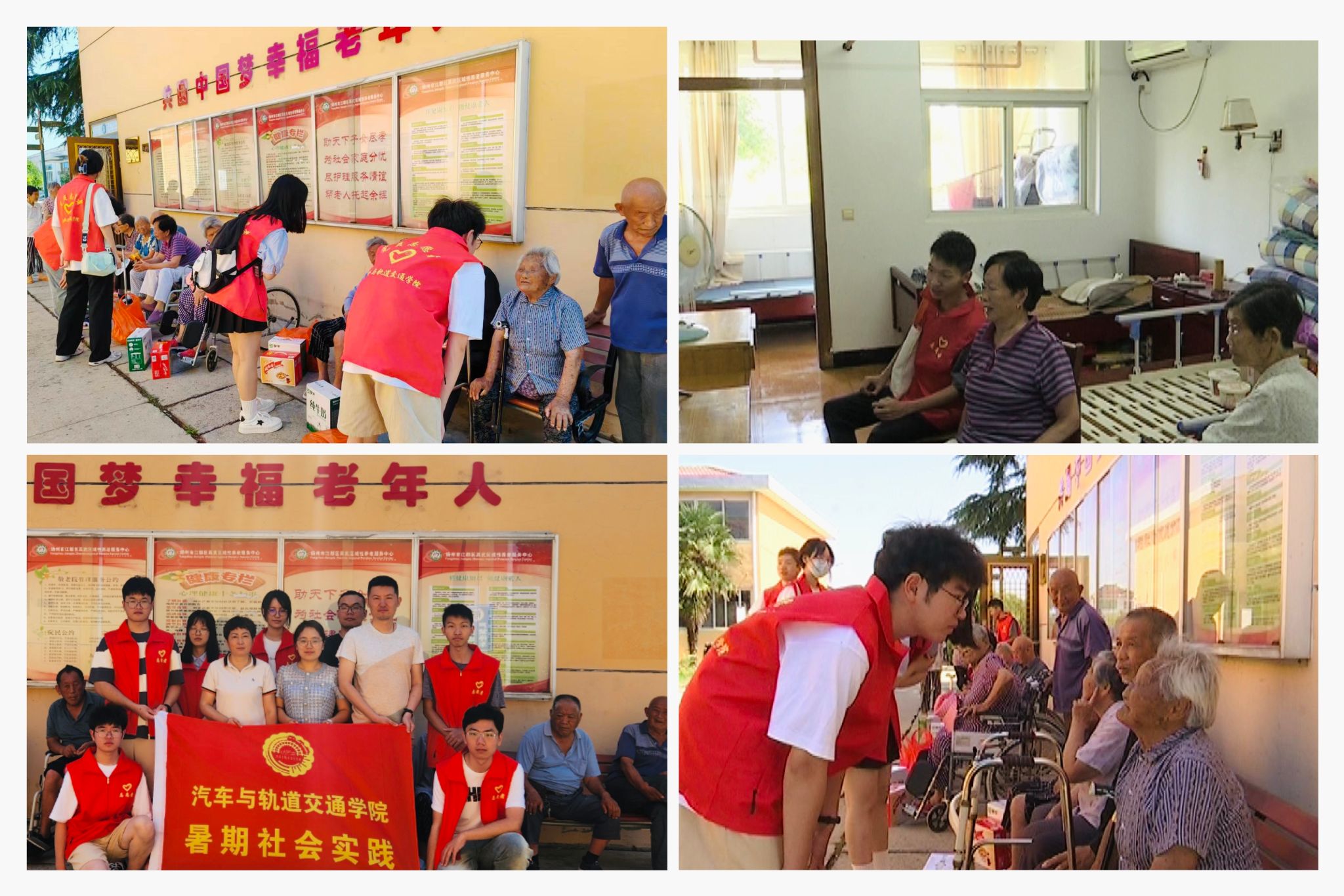 心系桑榆,情暖人间。在扬州市江都区,“放眼乡下”之“心系桑榆”小分队选择走进真武镇老年公寓来践行青年志愿精神。热情的学子们耐心地帮助老人打扫卫生、整理房间,为老人送来了牛奶、水果等生活物资。他们蹲坐在老人身边“聊心事、谈家常”,深入了解老人们生活琐事和困难,为老年人 “解心结、排心忧” ,让平日清静的养老院充满欢声笑语,让老年人绽放笑颜,让爱和温暖送达老人心间。