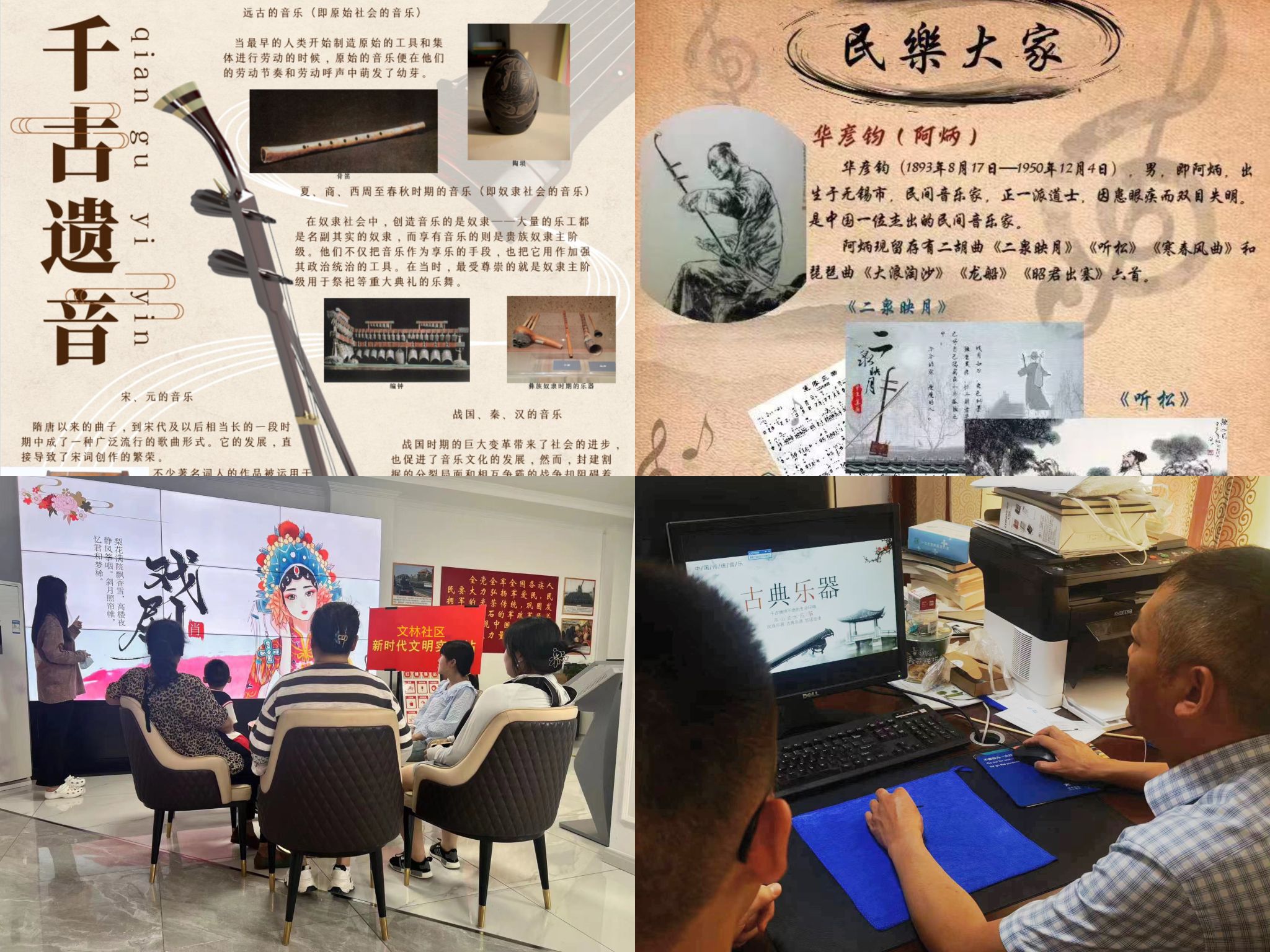 设计艺术展板,深入社区宣讲。为了让更多民众自觉了解和探索无锡民间音乐文化,传承和发扬民乐的传统和精髓,团队成员们结合查阅资料,设计无锡民间音乐文化宣传展板,深入社区进行民乐保护与传承理论宣讲分享,为传承发展无锡的民间音乐文化贡献青春力量。“我们设计的艺术展板分四大板块。第一板块‘千古遗音’,以时代为序,用呈示重要音乐文物的方式,对古代中国音乐各个时段的重要音乐现象给予介绍;第二板块‘太湖美韵’为近现代主要是无锡地方民乐的呈现;第三板块‘民乐大家’为无锡籍音乐家的介绍;第四板块‘国风千年’是世界级“非物质文化遗产”中中国音乐、戏曲有关内容的展呈。”在无锡市祝塘镇文林社区,团队成员高原向社区民众耐心介绍道。“越了解无锡民间音乐,越热爱无锡。越熟悉传统文化,越热爱中华文化。”计算机212班张阳说,希望尽自己的努力,保留传统,让更多人知道无锡民间特色音乐。