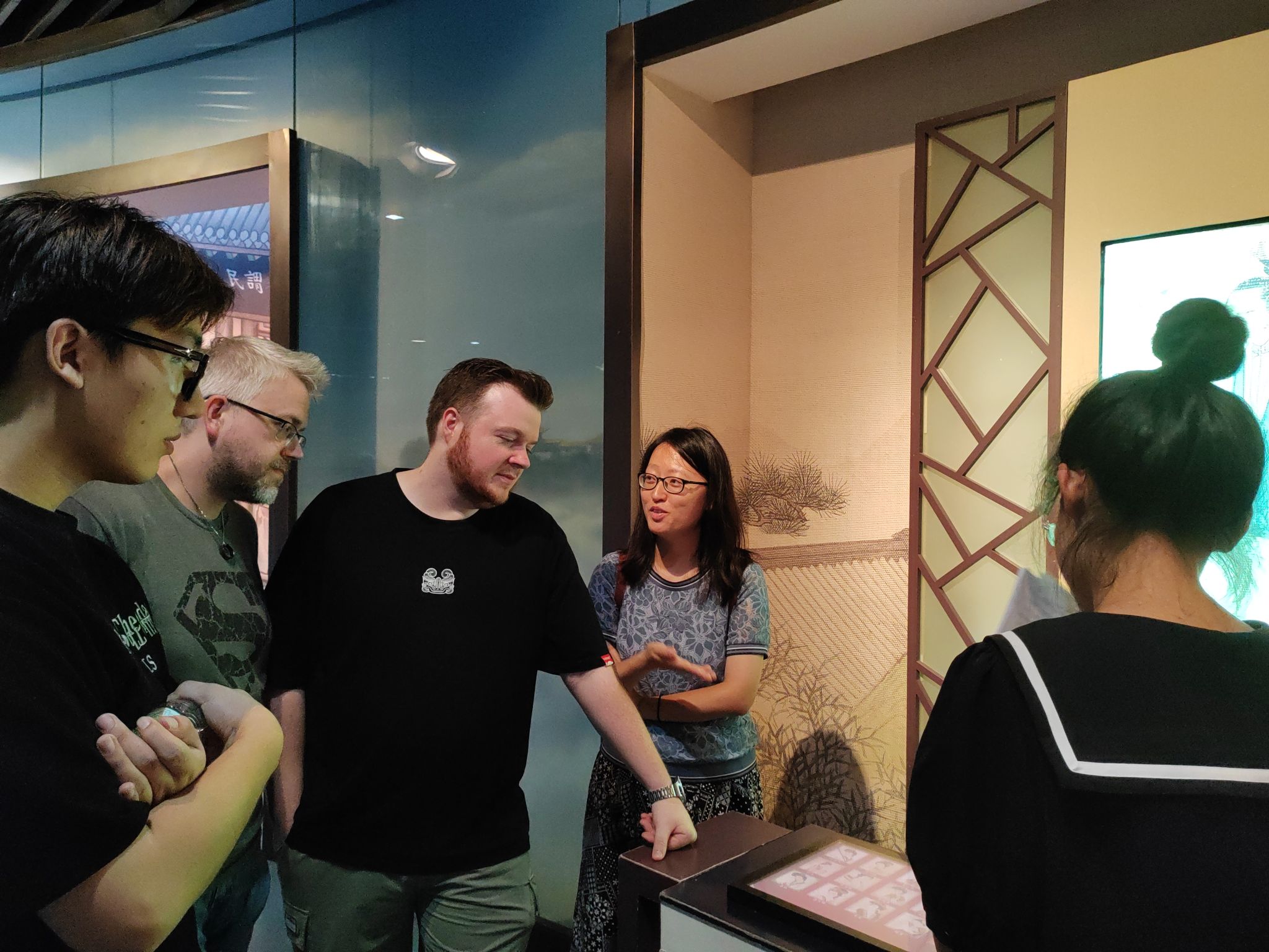 江宁织造博物馆在清代江宁织造遗址上所建,由著名建筑学家吴良镛先生亲自设计,曾是《红楼梦》作者曹雪芹故居地,目前是展示中国古代纺织品工艺的重要场所。跟随该院学生志愿者的讲解,外教们被古色古香的场景和琳琅满目的展品所吸引,从织造厅到云锦厅,再到红楼梦厅,感受到中国古代织造技术的辉煌成就。“每一件展品都像是一扇窗,透过它们,让我感受到了中国古代劳动人民对美的追求和对工艺的执着。”在古老的织机模型前,外教Royce不断为复杂且精巧的机械结构点赞,并表示这些模型不仅仅是历史的见证,更是人类智慧的结晶。