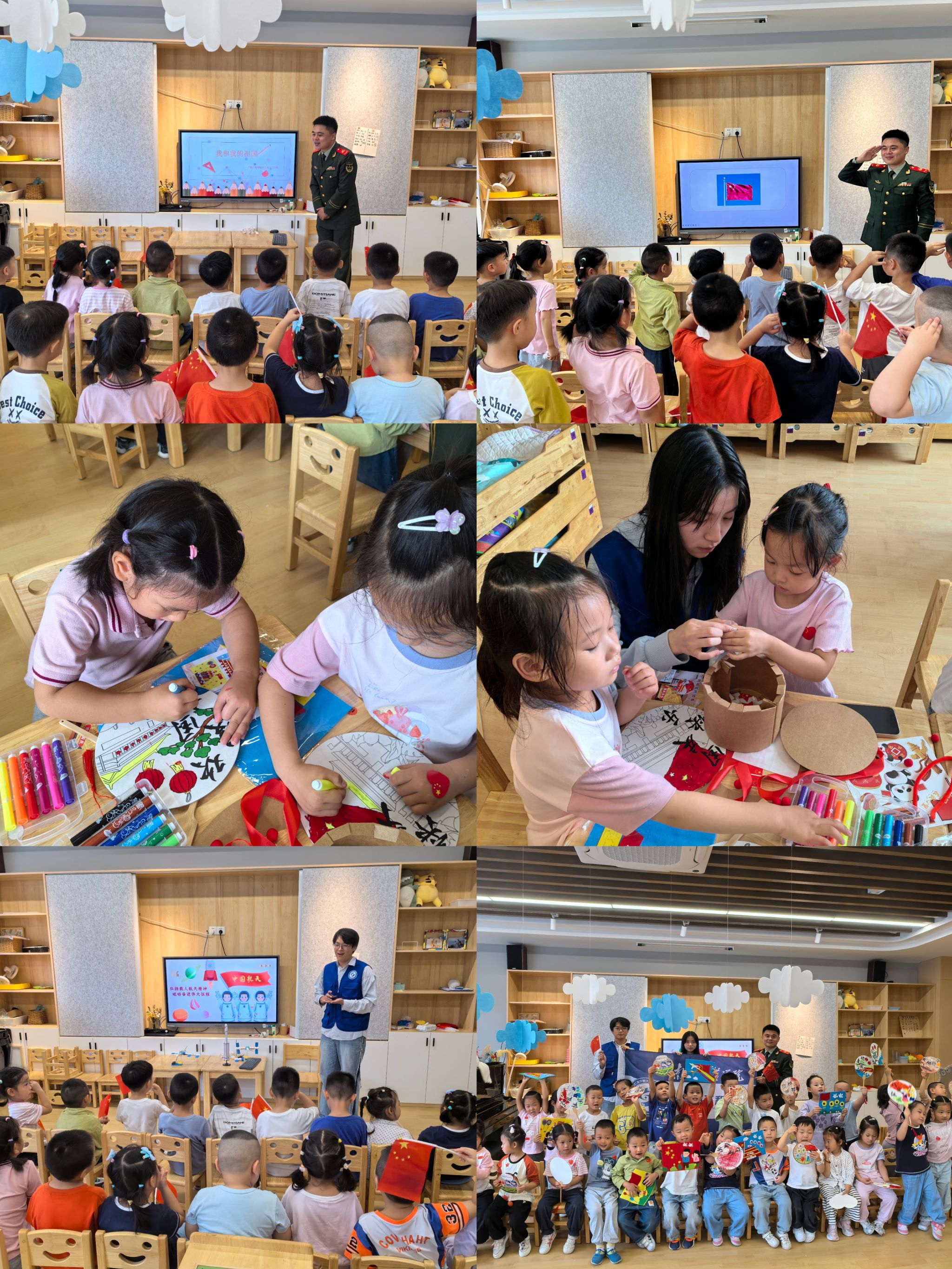 大手拉小手,共抒爱国情。9月29日,该院“指尖智荟”科技志愿服务团赴江宁科宁路幼儿园开展爱国主义教育活动。活动伊始,退伍大学生志愿者赵智阳向孩子们讲述了国庆节的由来,介绍了五星红旗旗面的颜色以及五颗星星的含义,带孩子们练习站军姿、敬礼,向祖国致敬。学生党员史昊烨和杨星怡介绍了我国载人航天事业取得的成就,弘扬科学家精神,在幼儿心中播种科技强国梦。活动中,团队成员和孩子们一起通过绘画、涂鸦、粘贴等形式,创作出国庆主题作品,表达对祖国深深的祝福,进一步激发幼儿的爱国情感。