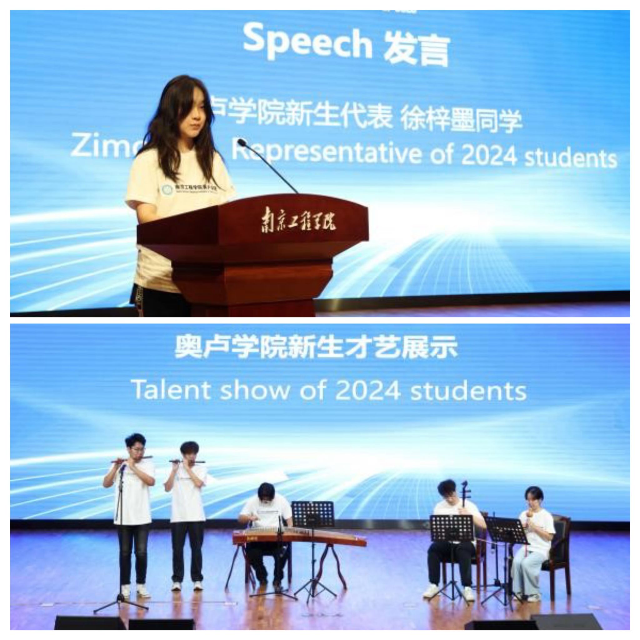 环境(中外)242班新生代表徐梓墨同学表示,将充分珍惜和利用合作办学的资源与平台,努力学习,开阔视野,实现人生的价值。仪式期间,新生们还带来古筝、二胡等民族器乐演奏。