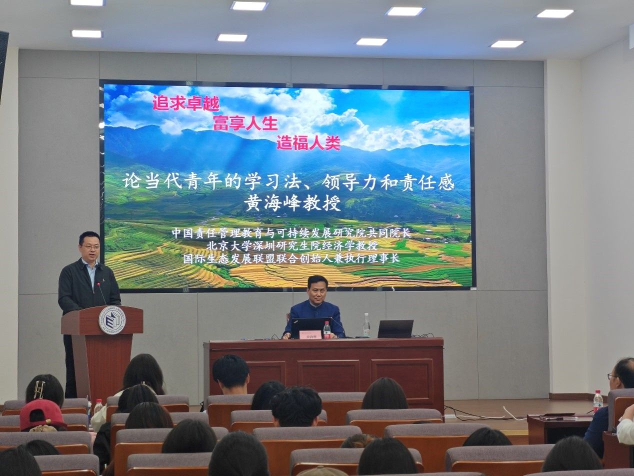 10月25日下午,应管理工程学院、商学院邀请,中国责任管理教育与可持续发展研究院共同院长、北京大学深圳研究生院经济学教授、国际生态发展联盟联合创始人黄海峰教授为学院师生作题为《论当代青年的学习法、领导力和责任感》的学术报告,报告会由永利官网党委常委、副校长陆华良主持,党委常委、人事处处长张焱,管理工程学院党委副书记、院长张泳出席报告会。