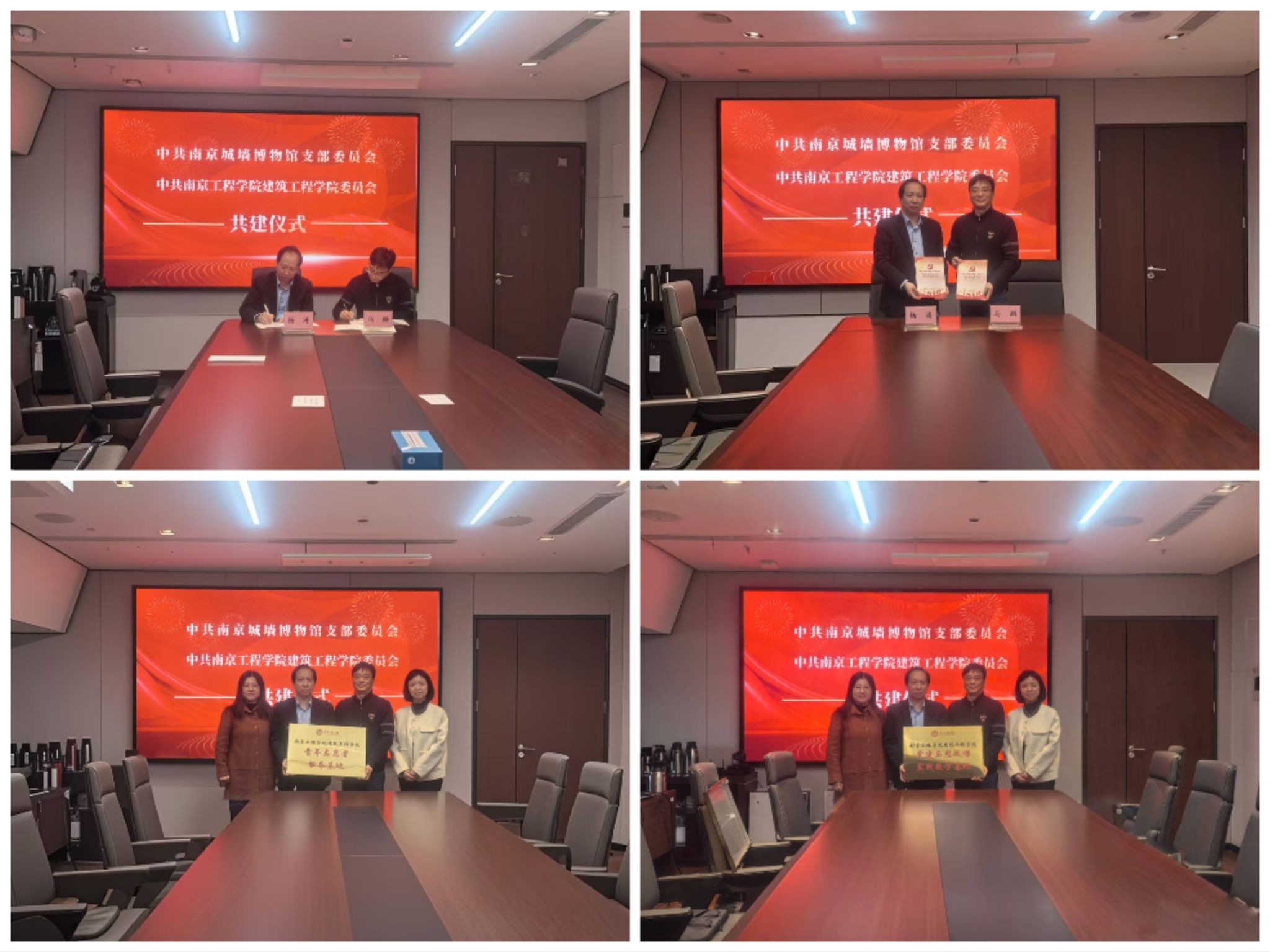 座谈会上,杨涛介绍了学院党建工作的基本情况,表示要坚持高质量党建引领高质量发展,深入推进“一融双高”建设和大中小学思想政治教育一体化建设,积极开展“一院一品”的党建品牌创建工作,通过强覆盖、强队伍、强示范,推动融合工作落地落实。张士萍简要介绍了学院的发展历程、专业建设成果、人才培养目标等,希望今后双方在产教融合、课程建设、人才培养等方面展开深入交流。马麟介绍了南京城墙博物馆的基本情况,分享了博物馆在文化创意产业方面的发展规划与需求。他希望以此次活动为契机建立定期沟通机制、细化合作内容,将博物馆“大课堂”融入高校“大思政”,期待通过馆校共建,做出表率,为南京城墙保护和申请世界文化遗产做出贡献。会上,双方签订了党建共建协议,并为党建与思政课程教学基地和青年志愿者服务基地揭牌。