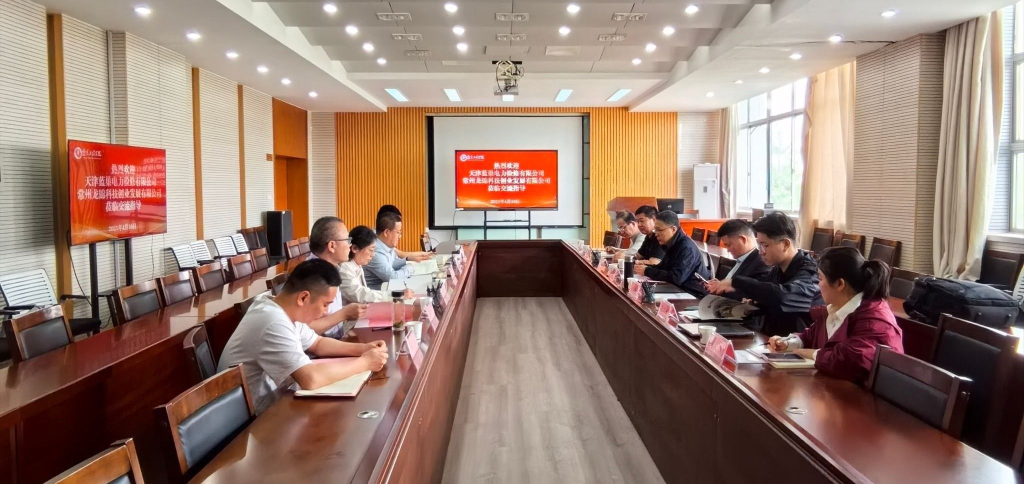为进一步加强校企合作,实现共同发展,4月10日,天津蓝巢电力检修有限公司党委委员、总工程师张建广,常州龙锦科技创业发展有限公司董事长孙国栋带队来访能源与动力工程学院,学院党委书记徐艳,党委副书记、副院长(主持工作)薛锐及相关骨干教师参加。