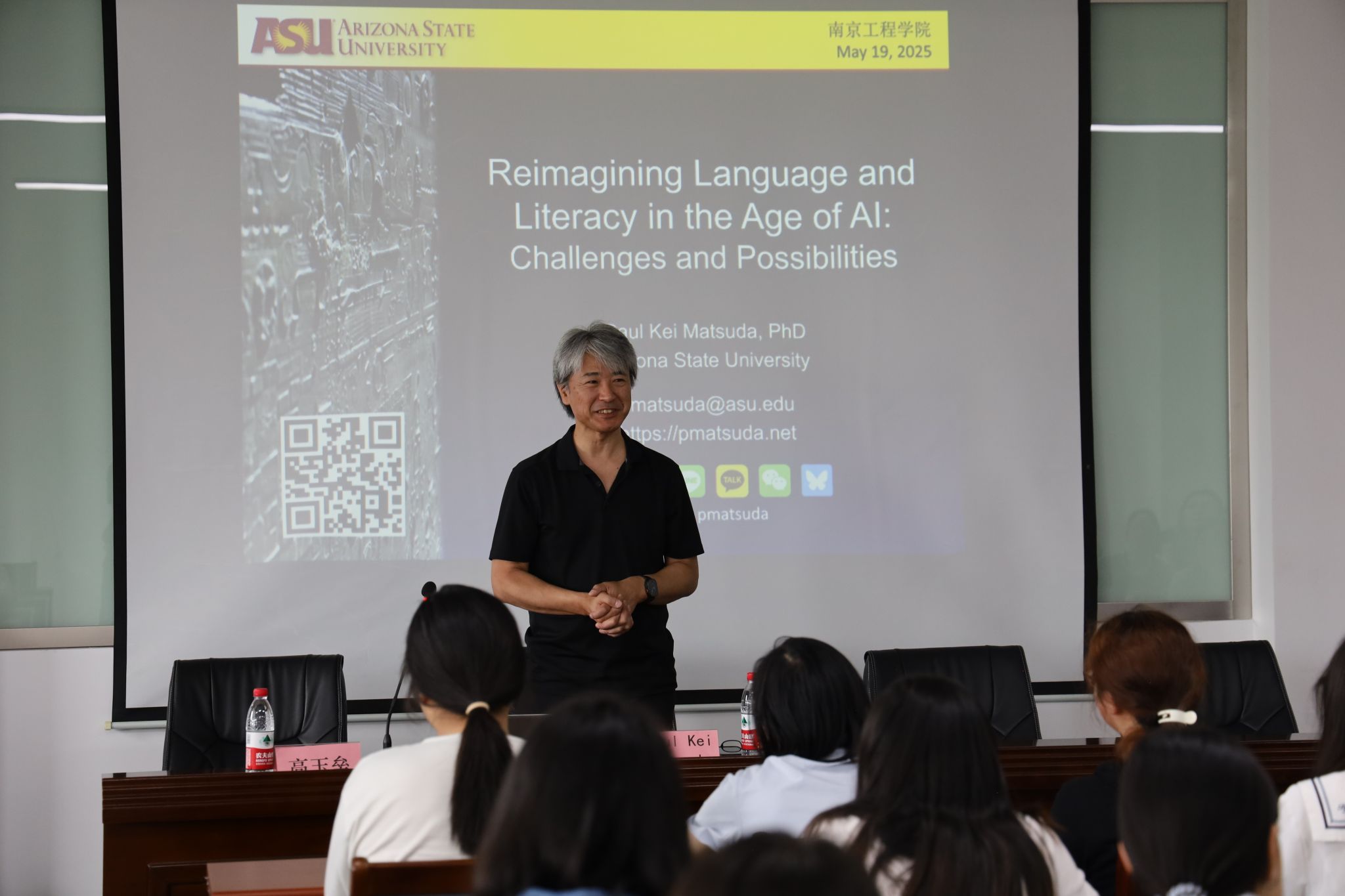 5月22日上午,美国亚利桑那州立大学英语教授、二语写作研究领域专家Paul Kei Matsuda应邀来外国语学院,作题为“Reimagining Language and Literacy in the Age of AI”的学术讲座。外国语学院60余名师生参加,讲座由高玉垒博士主持。