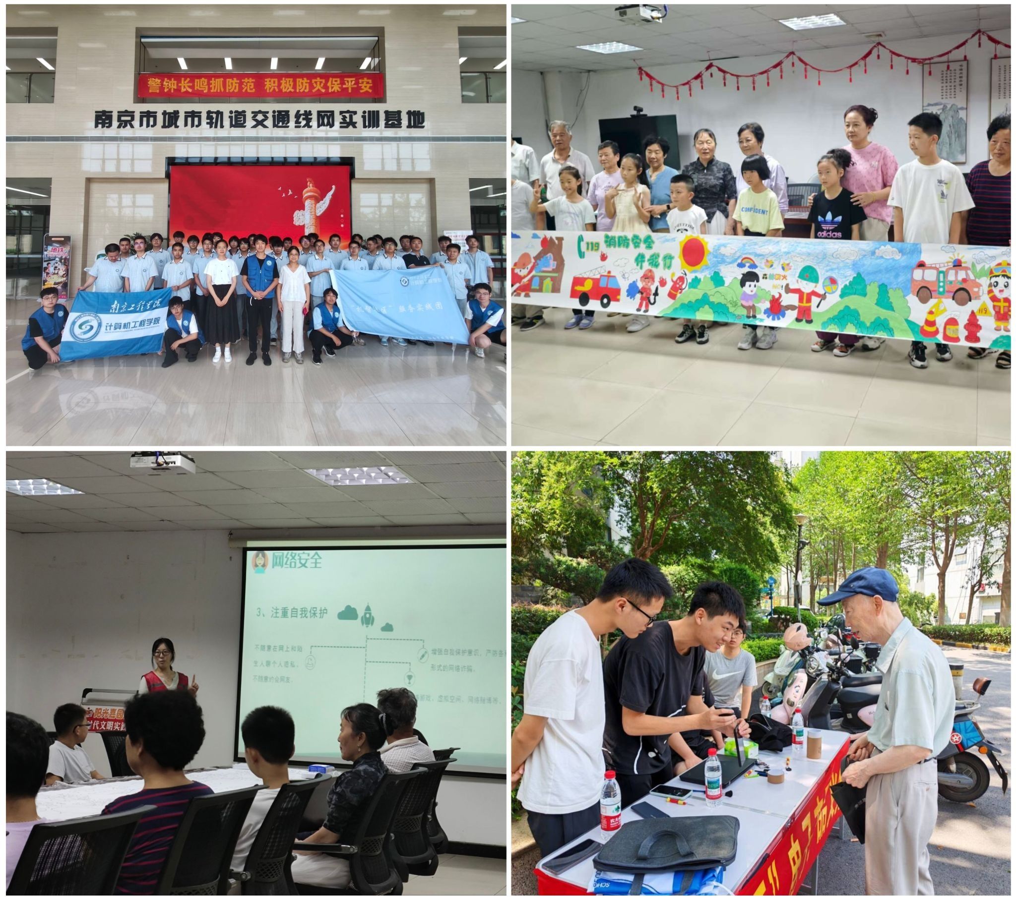 实践团成员来到马群南京城市轨道交通线网实训基地,体验地铁运行奥秘并参观马群社区智慧化建设情况,开拓专业学习视野;在社区实训中心为青少年开展编程启蒙,通过基础知识和互动游戏生动讲解编程逻辑,激发学习信息技术的兴趣;向社区儿童及老人普及网络安全知识,通过解读法规、剖析常见的电信诈骗手段及对应防范技巧、绘制网络安全宣传画等形式提升居民的防范意识和应对能力;成员们还为社区提供义务维修服务,耐心地为社区居民解决电脑清灰、软件安装等服务,赢得了社区居民的赞誉。